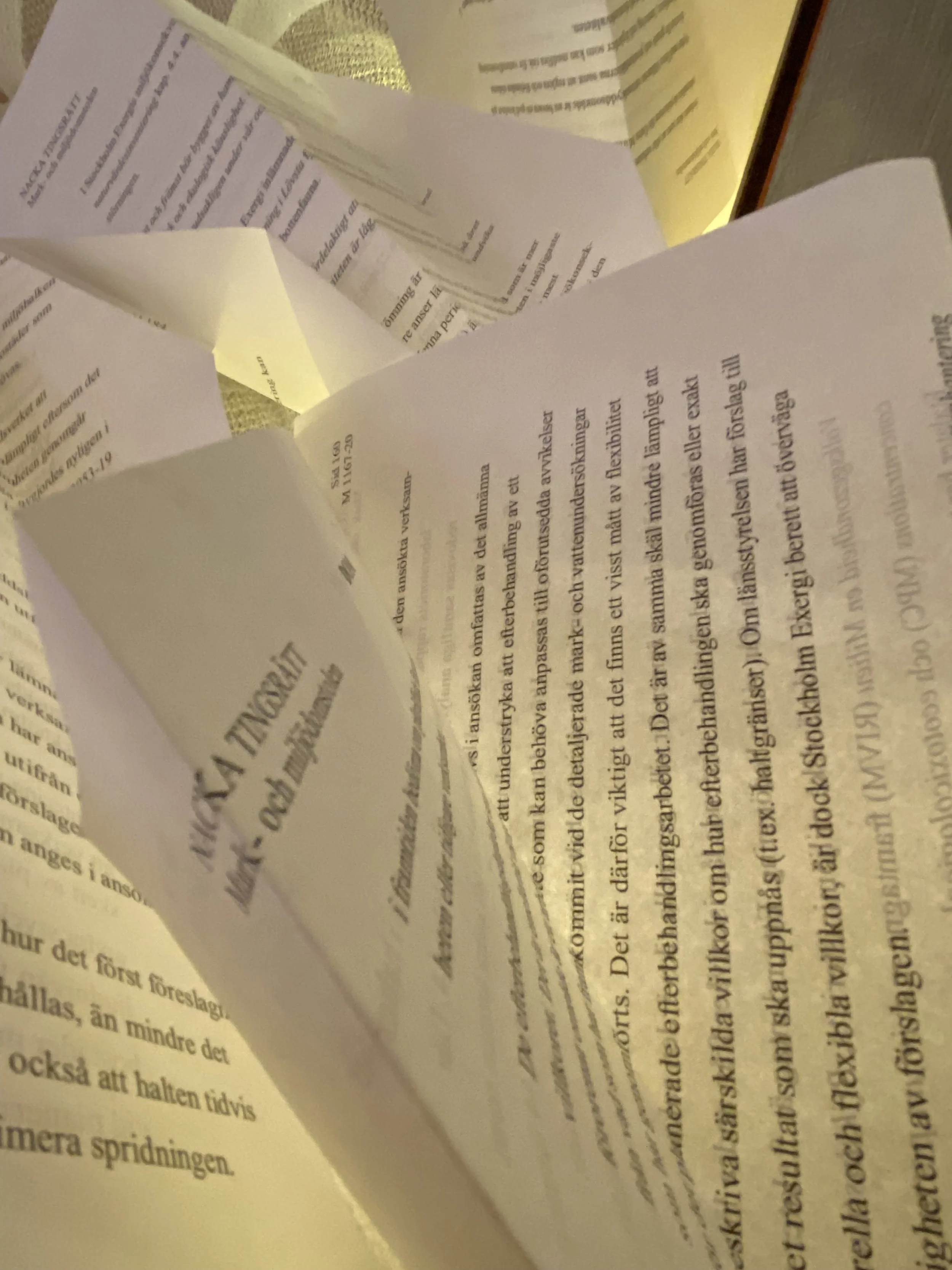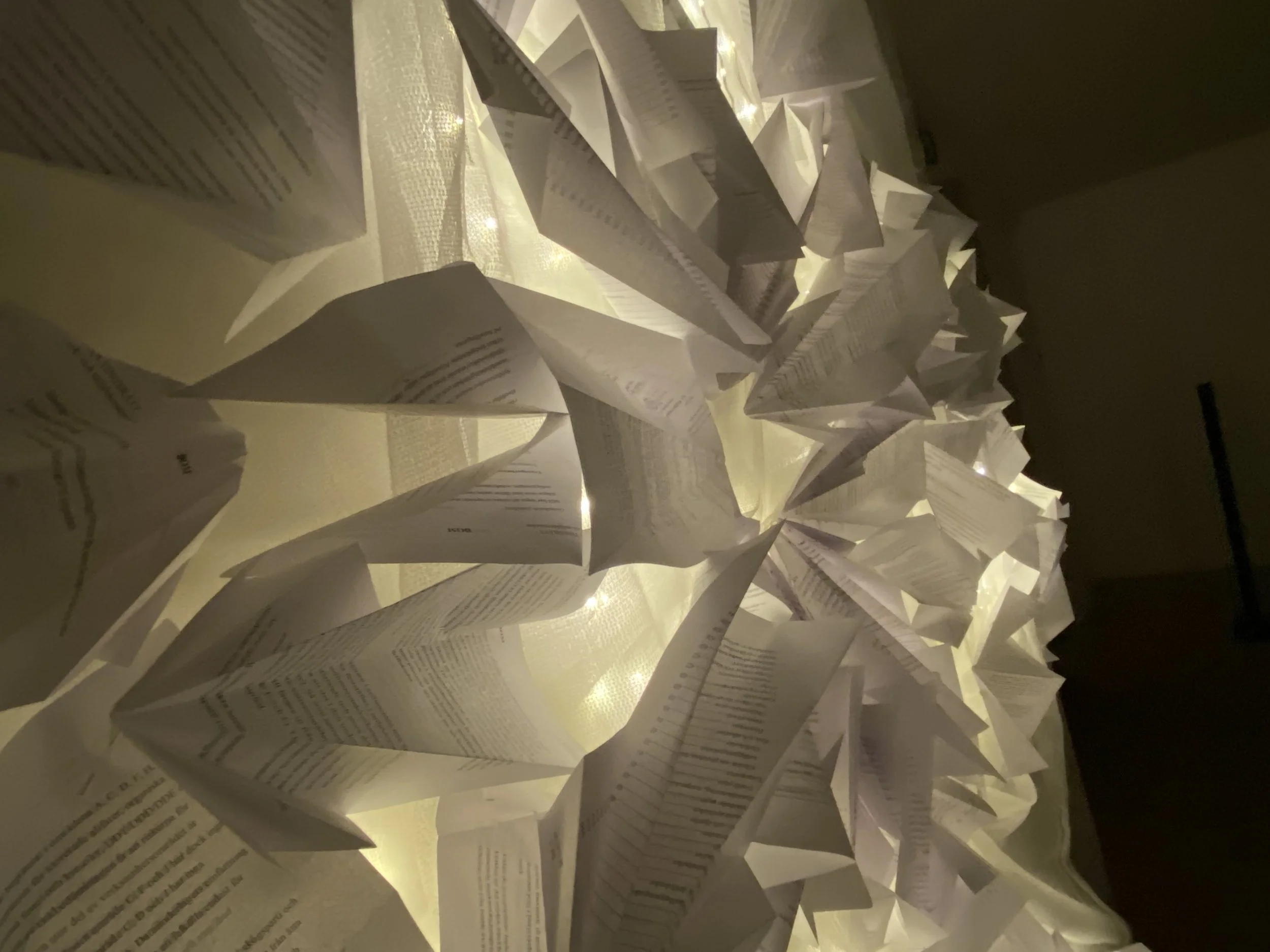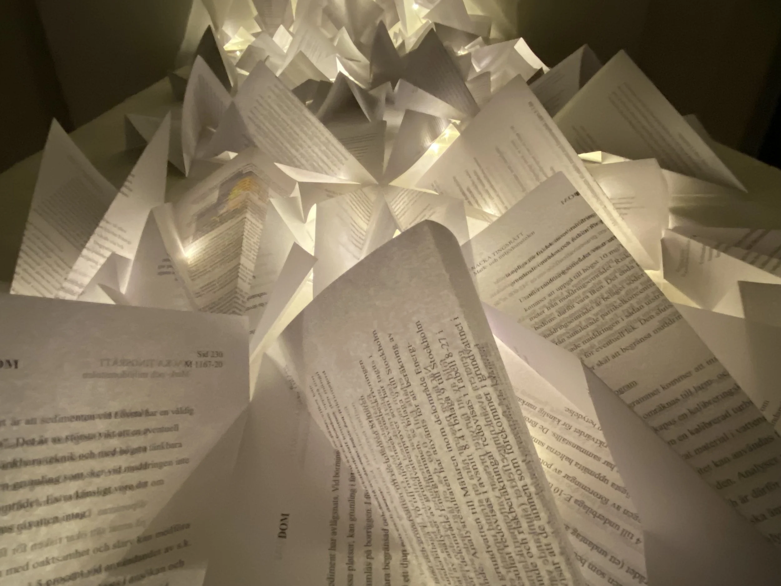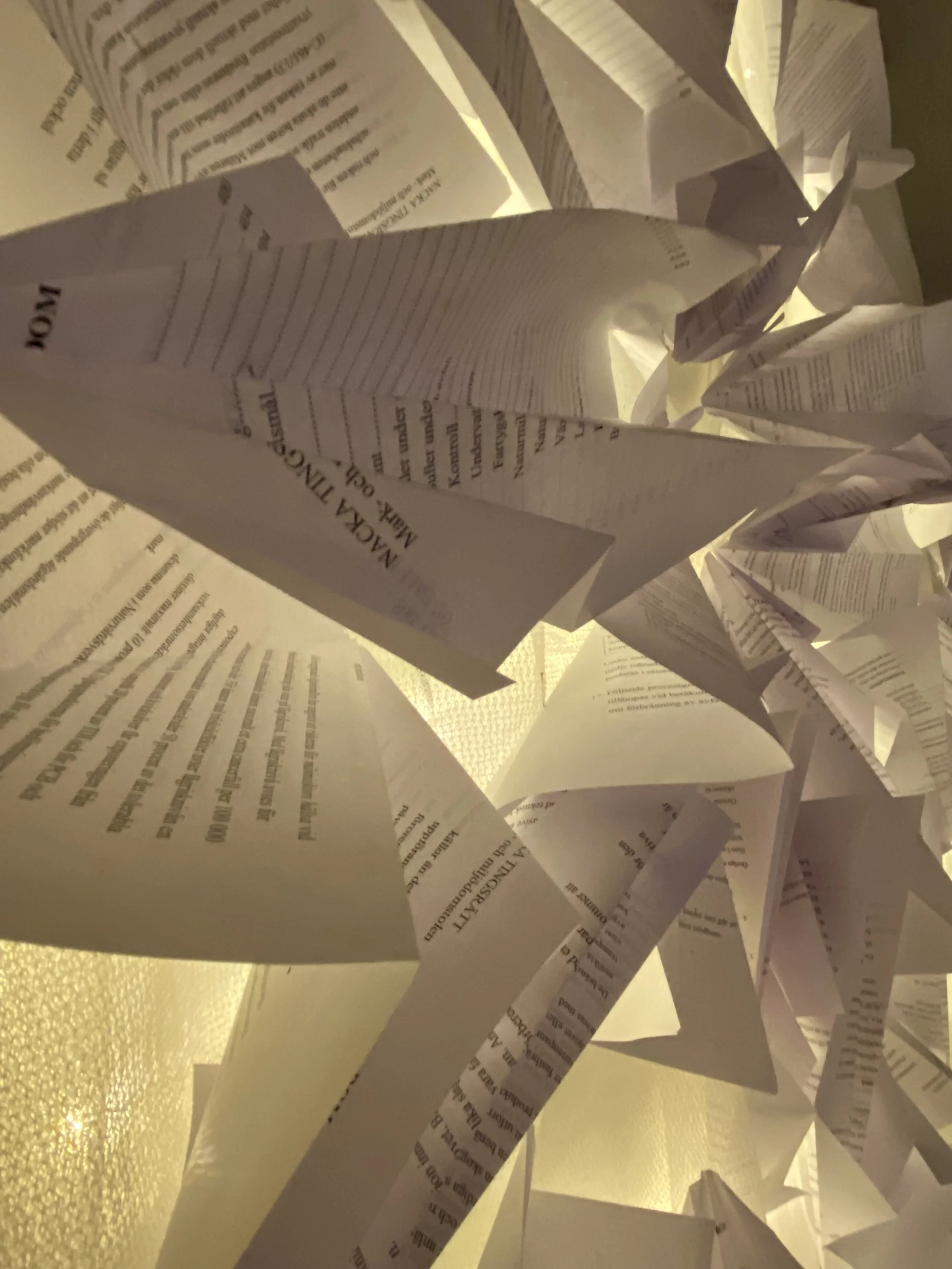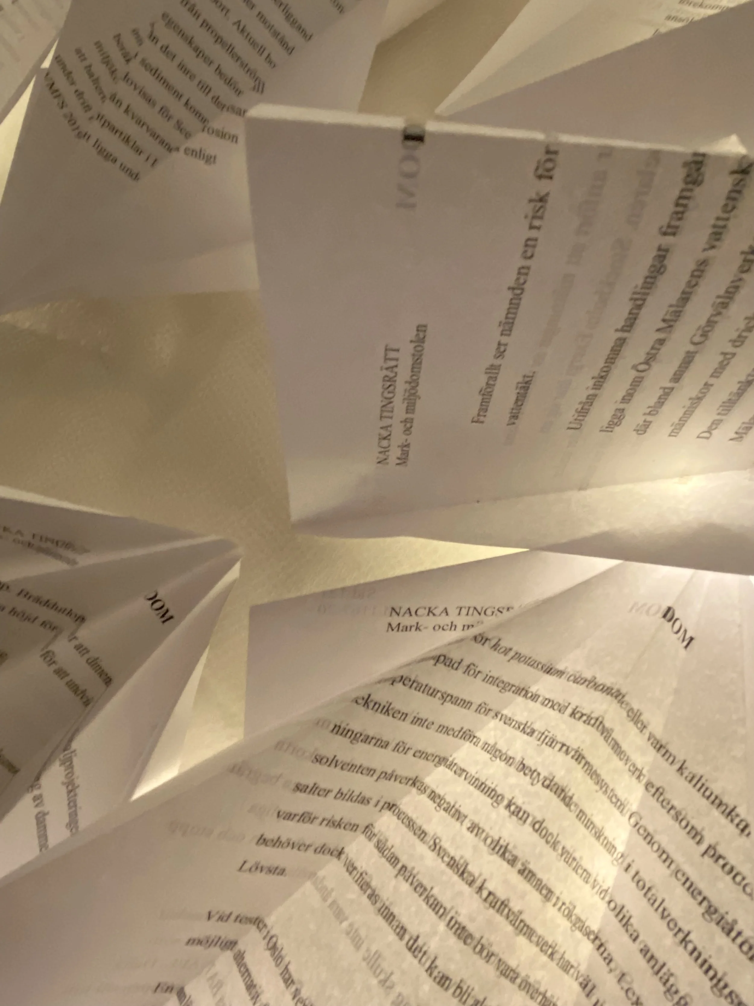 The viewer witnesses “The Verdict” installation take form and expand during many hours of this live Performance “Save Lövsta”. The work is made from recycled paper taken from the 494 page verdict for appealing the proposition to build a waste burning facility in the nature preserve area surrounding LiMi’s studio. This document was mailed out to all businesses, tenants and households in the effected area from The Swedish Land and Environment Court.